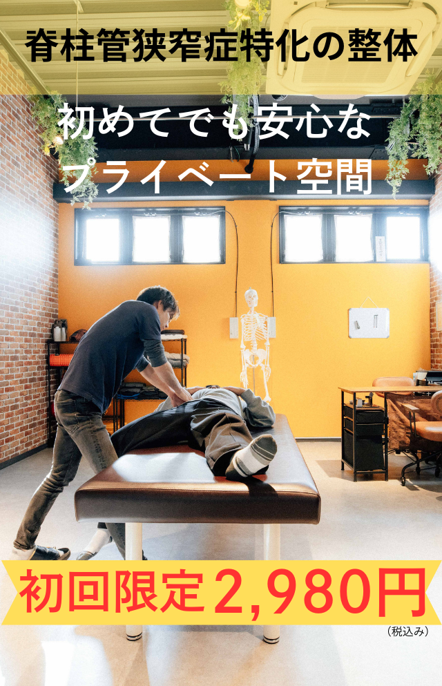 脊柱管狭窄症では、腰や骨盤の歪み、筋肉の過緊張が神経を圧迫し、痛みやしびれが生じるケースが多いため、骨格調整を行い、神経の働きを正常な状態へ導くことを目指します。
